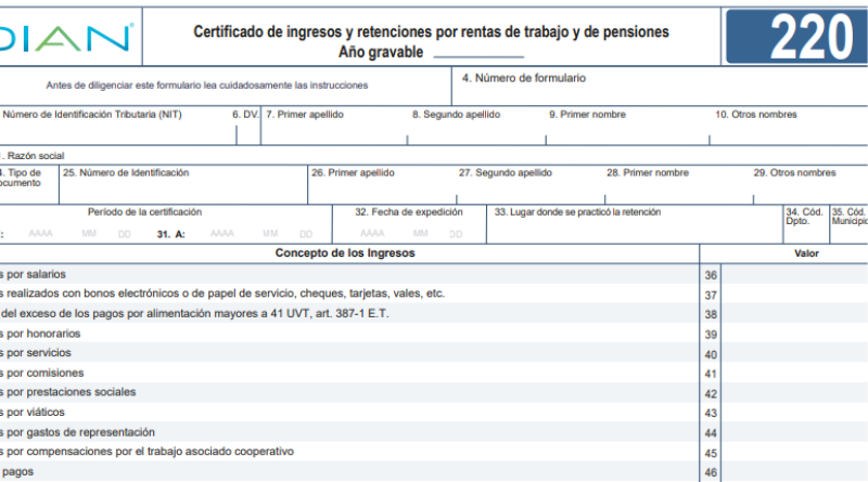 La Dirección de Impuestos y Aduanas Nacionales (DIAN) expidió la Resolución No. 000022 del 20 de febrero de 2024*, por medio de la cual prescribió el Formulario No. 220 – Certificado de ingresos y retenciones por rentas de trabajo y de pensiones para los años gravables 2023 y siguientes.