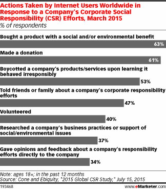 Today’s consumers expect companies to focus on more than the bottom line—addressing social and environmental issues is also important. According to March 2015 polling by Cone and Ebiquity, 91% of internet users worldwide expected companies to do more than make a profit.