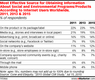 Companies must mix channels when promoting CSR efforts, as responses were spread when internet users were asked about the most effective communication channels for information about social and environmental programs and products. Respondents were most likely to want to see this info on the product or its label. Media, advertising, social media and websites were all cited by similar percentages.