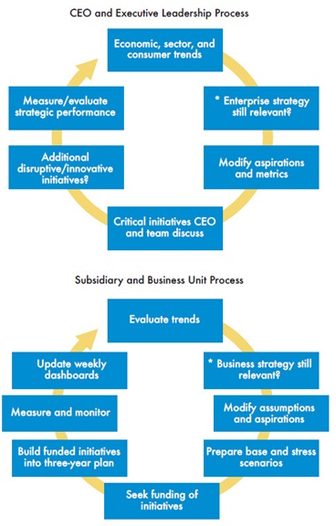 Massachusetts Mutual Life Insurance Co. developed a framework to address such factors. The “Pinwheel” (see Figure 1) illustrates how the CEO and other executives work through the company’s ongoing strategy and financial planning and analysis (FP&A) process at the enterprise level while subsidiary and business unit leaders work through their own process. It is essential that the two groups exchange information — the ultimate goal being that all parts of the organization are aligned.