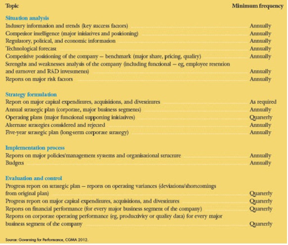 Effective governance requires a tailored information strategy for the executive leadership team and the board of directors (see Figure 2 for factors the board should consider — and how frequently — to assess strategic performance). This should include: