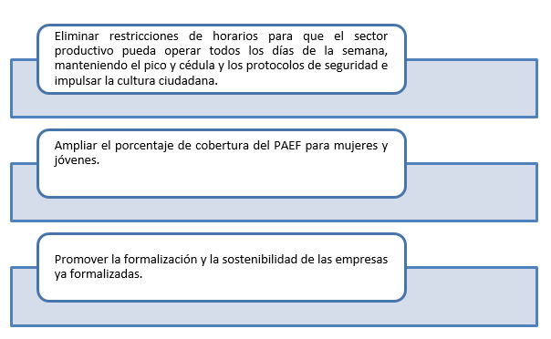 1. Eliminar restricciones de horarios para que el sector productivo —comercio, industria y servicios- pueda operar todos los días de la semana, manteniendo el pico y cédula y los protocolos de seguridad e impulsar la cultura ciudadana.