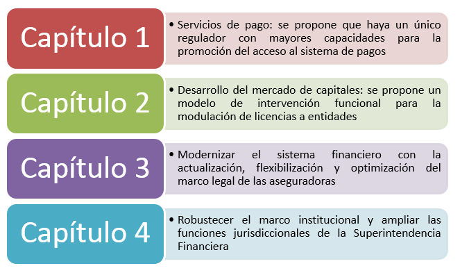 El proyecto se divide en cuatro capítulos centrados en que en el país se cuente con un marco legal flexible y en línea con estándares internacionales, alcanzando una mayor adopción tecnológica e innovación en el sistema de pagos, en el mercado de capitales y en la industria aseguradora.