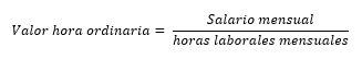 Respecto al cálculo del valor de la hora ordinaria de trabajo, la cual es de vital importancia para la liquidación de horas extras y recargos en la nómina de cada trabajador, se precisa que deberá hacerse teniendo en cuenta la jornada laboral máxima de cada año. Cabe aclarar que la fórmula para el cálculo de dicho valor no varía, siendo esta así: