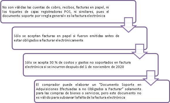 3. Sólo se acepta 30 % de costos y gastos no soportados en factura electrónica si se incurren después del 1 de noviembre de 2020 (o del 15 diciembre para Agricultura, Ganadería, Caza, Silvicultura y Pesca), según artículo 83 de la Resolución DIAN 000042 de 2020).
