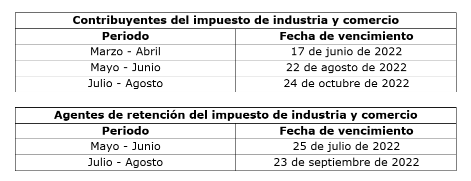 Por medio de la Resolución No. 178 de 2022*, la Secretaría Distrital de Hacienda (SDH) amplió las fechas de vencimiento para la declaración y pago de los bimestres 2 a 4 del impuesto de industria y comercio y el complementario de avisos y tableros, con el fin de garantizar a los contribuyentes y agentes retenedores, el adecuado de cumplimiento de obligaciones tributarias. Esta medida aplica para los sujetos pasivos pertenecientes al régimen común cuyo impuesto a cargo, correspondiente a la sumatoria de todo el año gravable 2021, exceda de 391 UVT ($14.196.428); y los agentes retenedores de dicho tributo. Las nuevas fechas son: