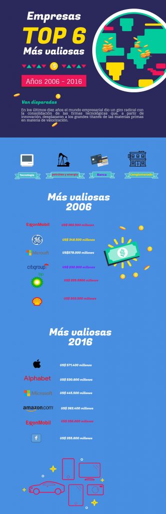 CompañiasDurante la última década, el listado de las compañías más valiosas ha cambiado mucho. De acuerdo con la firma Statista, que realizó el estudio con cierre en 2016, hace 10 años Facebook estaba apenas creciendo y el teléfono inteligente no era lo que es hoy. Las empresas de commodities dieron paso a nuevas organizaciones: Apple, Alphabet (Google), Microsoft, Facebook y Amazon. ExxonMobil, que lideraba en 2006, es de las pocas que se mantiene arriba, ubicada en el sexto lugar.