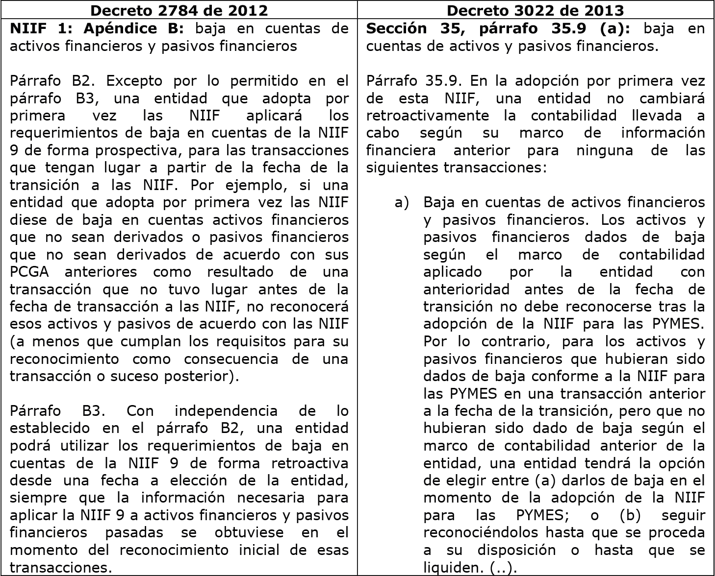 En los marcos técnicos normativos contenidos en los Decretos Reglamentarios 2784 de 2012 y 3022 de 2013 (NIIF 1, Apéndice B, párrafo B2 y B3 y NIIF para PYMES, párrafo 35.9 (a) se prohíbe el ajuste retroactivo de la baja en cuentas de los activos y pasivos financieros, en los siguientes términos: