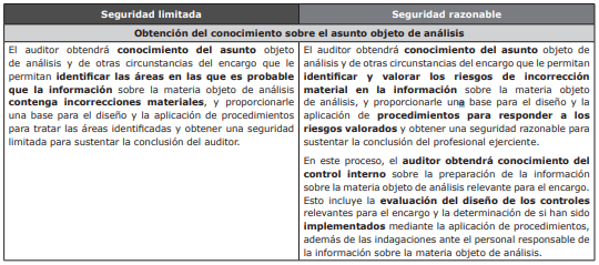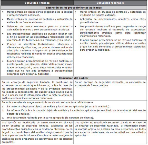Con base en lo comentado anteriormente, a continuación se relacionan las diferencias entre un encargo de aseguramiento de seguridad limitada y de seguridad razonable que deben ser consideradas en el desarrollo de los encargos de aseguramiento: