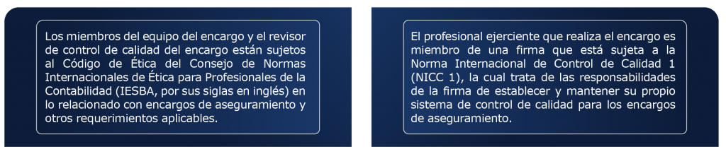 Al desarrollar este tipo de encargos, el profesional ejerciente (el auditor) se debe regir por los principios de ética y las normas de control de calidad, las cuales consideran que: