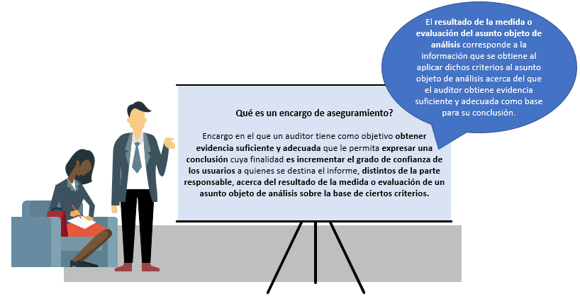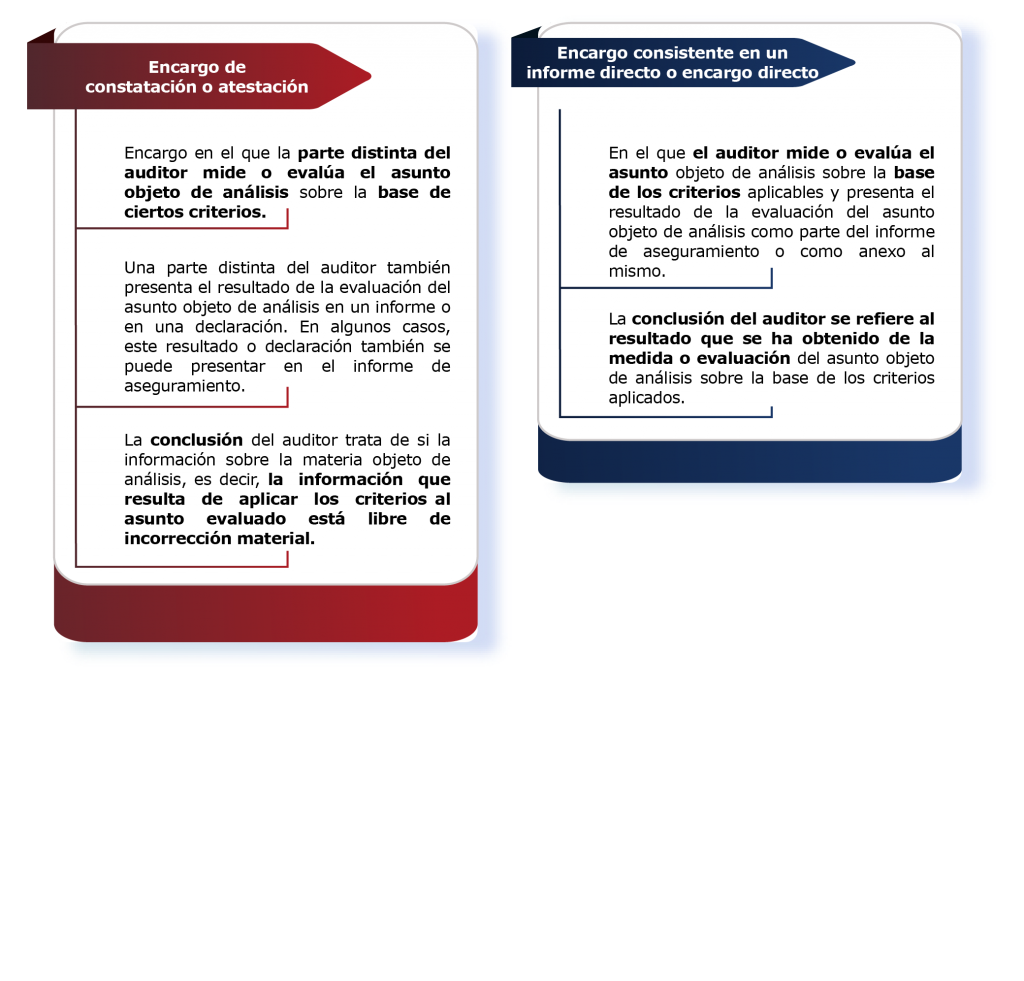 Existen dos tipos de encargos de aseguramiento: 1) encargo de constatación o atestación y 2) encargo consistente en un informe directo o encargo directo, cuya distinción depende de quién mide o evalúa la materia subyacente objeto de análisis, es decir, el tema que se mide o evalúa mediante la aplicación de ciertos criterios. Por otro lado, dependiendo del encargo a desarrollar existen dos niveles de aseguramiento, que son de seguridad razonable o seguridad limitada.