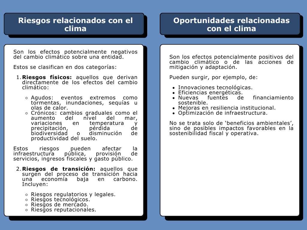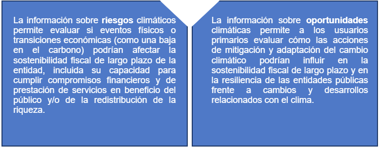 Según IPSASB, los riesgos y oportunidades asociados al cambio climático pueden afectar razonablemente la sostenibilidad fiscal de largo plazo y la capacidad de las entidades públicas para cumplir su función esencial: prestar servicios y administrar recursos en beneficio del interés general.