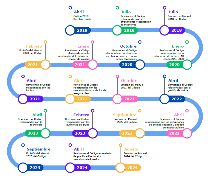 A continuación, se presenta una ilustración de las revisiones del Código emitidas desde la versión reestructurada (2018). Cabe recordar que la versión vigente en Colombia es la de 2014, adoptada mediante el Decreto 2270 de 2019.