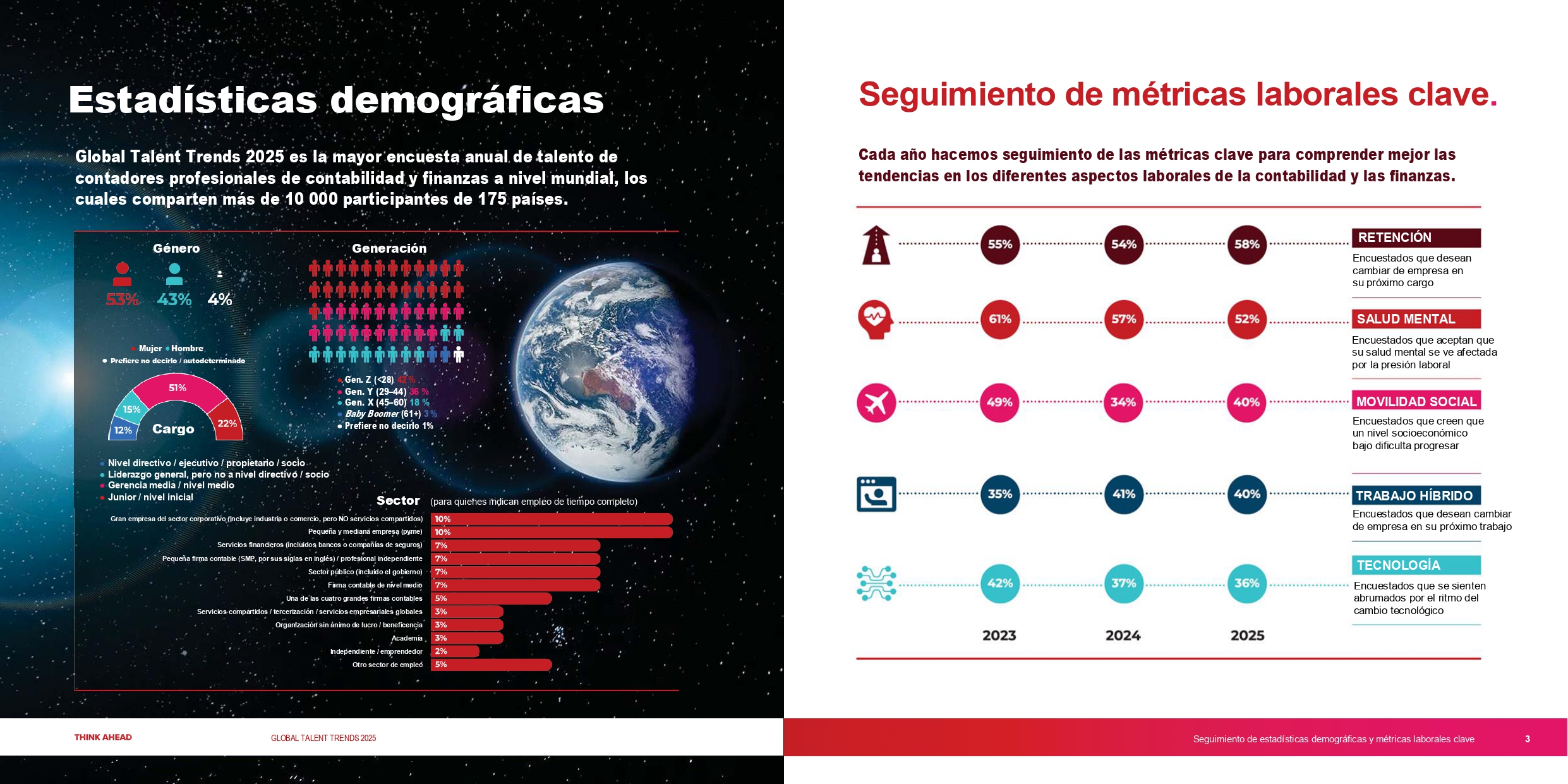 El informe ‘Global Talent Trends 2025’ de la Asociación de Contadores Públicos Certificados (ACCA, por sus siglas en inglés), publicado en mayo de 2025, reúne los resultados de una encuesta global sobre el mundo laboral en contabilidad y finanzas, con la participación de más de 10.000 personas de 175 países. El estudio analiza asuntos como: modalidades de trabajo, inclusión, expectativas salariales, desarrollo de habilidades, movilidad y permanencia en las organizaciones.