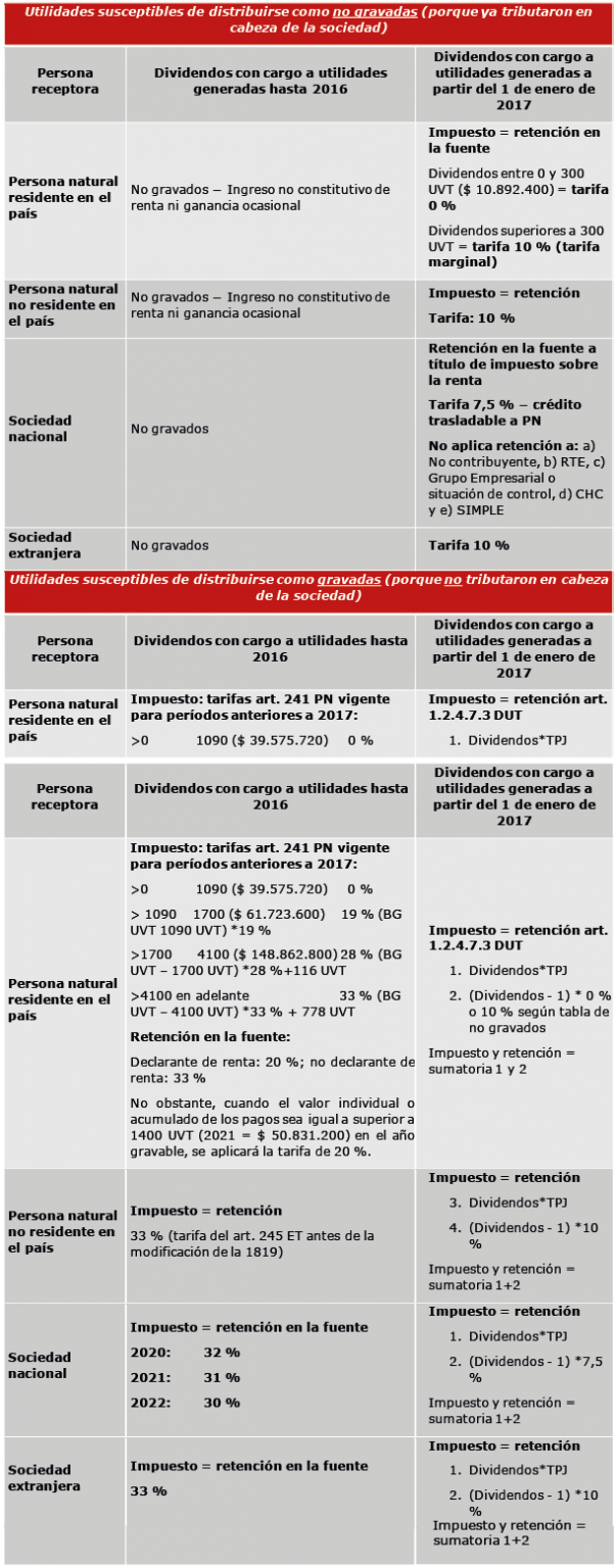 A propósito de la Asamblea Ordinaria de Accionistas, que llevarán a cabo las sociedades con fecha máxima a 31 de marzo de 2021, en las cuales se estudiarán los estados financieros con corte a 31 de diciembre de 2020 y se decidirá sobre la distribución de dividendos, compartimos este artículo que contiene recomendaciones básicas a tener en cuenta, para la aplicación de las tarifas de impuesto y retención en la fuente por concepto de dividendos.